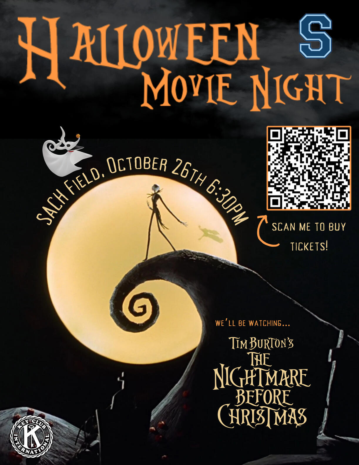 Watch a movie under the stars with us this October 26th on the SACH field, in celebration of Halloween! We will be watching the Nightmare Before Christmas, so come in a cozy outfit and bring blankets to lie down on the field! Popcorn and other food will be sold, so be sure to bring money!